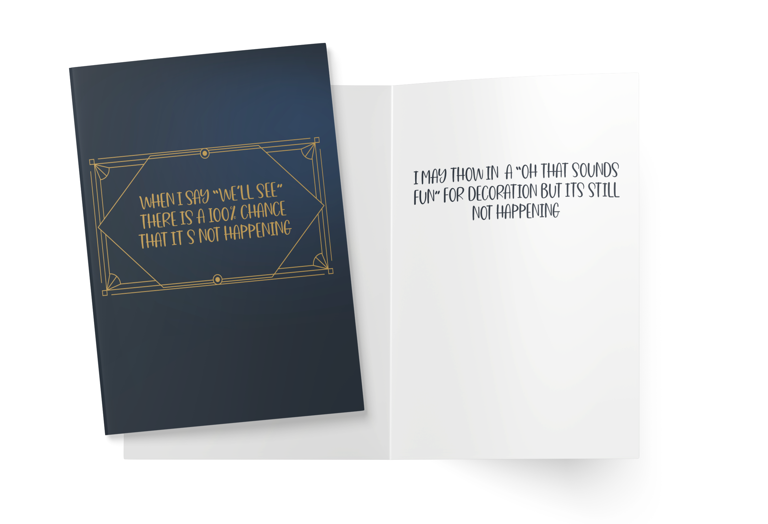 We’re just getting started at Snarky Cards, so we’re printing on demand — no dusty stockpiles or warehousing yet. Why? Because no one handed us a hefty trust fund to stack up inventory. Your enthusiastic buying sprees will pave the way for us to switch from print-on-demand to ordering in bulk from high-quality printers. This means we’ll soon be able to stock up on all your favorites, fulfilling orders at lightning speed right from the upcoming heart of our operation: my very own living room. And yes, that means my kids will graduate from TV critics to shipping moguls, packing your orders under my watchful, entirely ethical supervision.